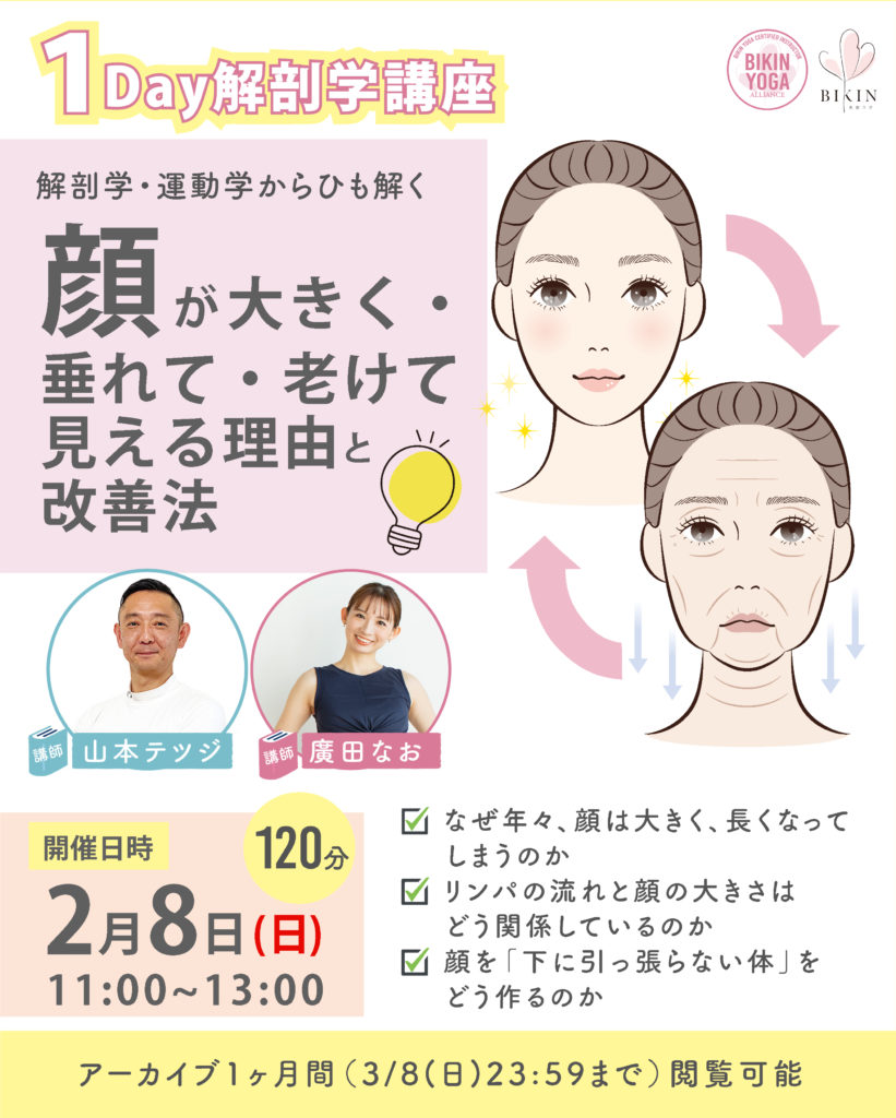 1Day 講座ONE DAY TRAINNG 1Day講座 では、美筋ヨガを効率的に実施するための骨格や筋肉などの動きを「解剖学」の知見から学ぶことができます。 講座一覧 講座の様子(動画) 講師養成講座を見る 認定講師のご紹介 講座一覧 ~解剖学と運動学から紐解く~ 顔が大きく垂れて老けて見える理由とその改善法 チケット購入2月7日(水)18:00 〆切視聴期限3月8日(日) 23:59 まで料金一 般 :18,900円(税込)認定講師:12,900円(税込) 申し込みはこちら 講座の様子